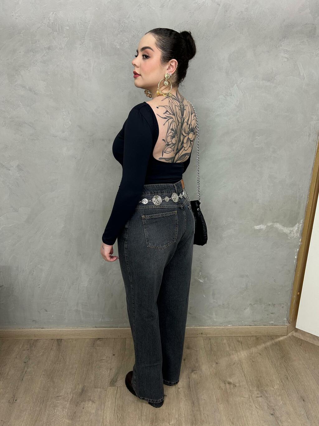 Seu corte wide leg traz um visual sofisticado e fluido, garantindo liberdade de movimento e valorizando todos os tipos de corpos. O tom jeans preto lavado oferece versatilidade, permitindo composições que vão do casual ao elegante. Com cintura alta e fechamento por zíper e botão, modela a silhueta e alonga as pernas, criando um visual poderoso e atemporal.
